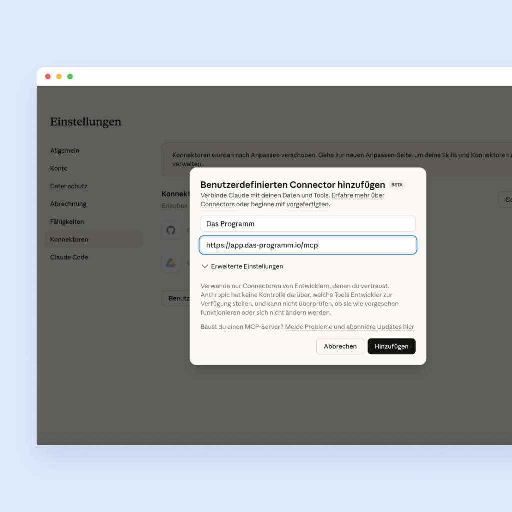 Die MCP Schnittstelle einzurichten, ist vor allem für Claude.ai sehr einfach.