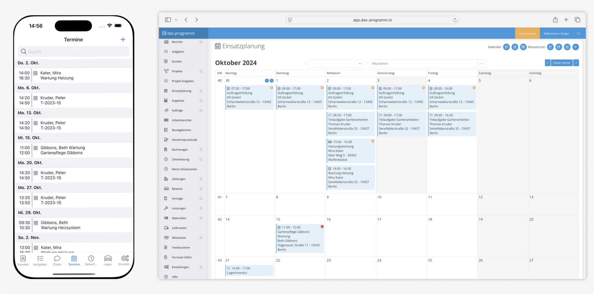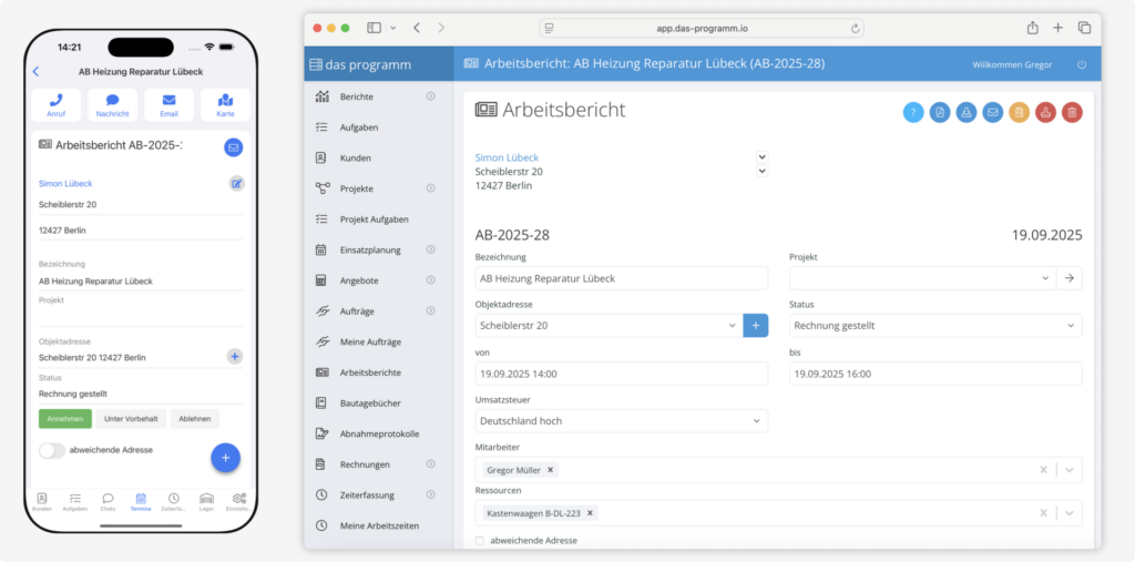 Neue Aufträge legst du in wenigen Klicks an und weist sie Mitarbeitern zu. Diese erhalten alle Infos per App, dokumentieren Material, Zeiten und Unterschriften vor Ort – im Büro ist alles sofort sichtbar.