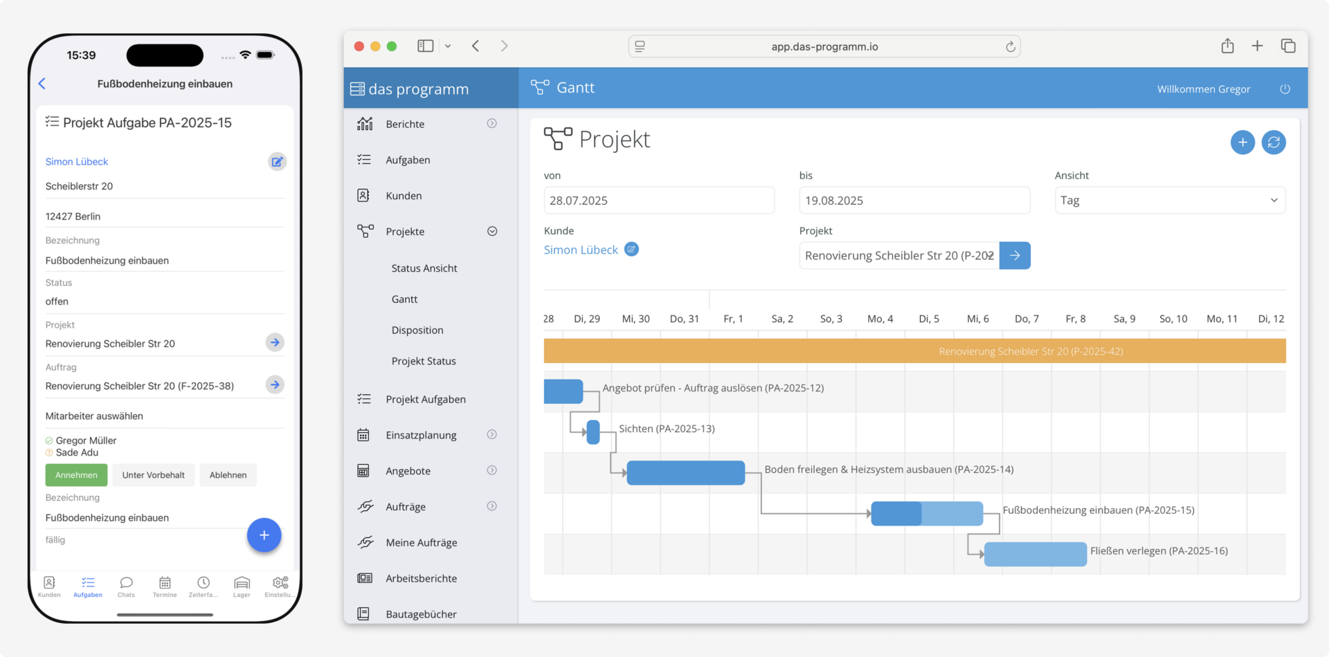 Mit dem integrierten Projektmanagement steuerst du Baustellen, Aufgaben und Termine zentral. Dein Team weiß jederzeit, was zu tun ist, und du behältst Kosten und Fortschritt im Blick.
