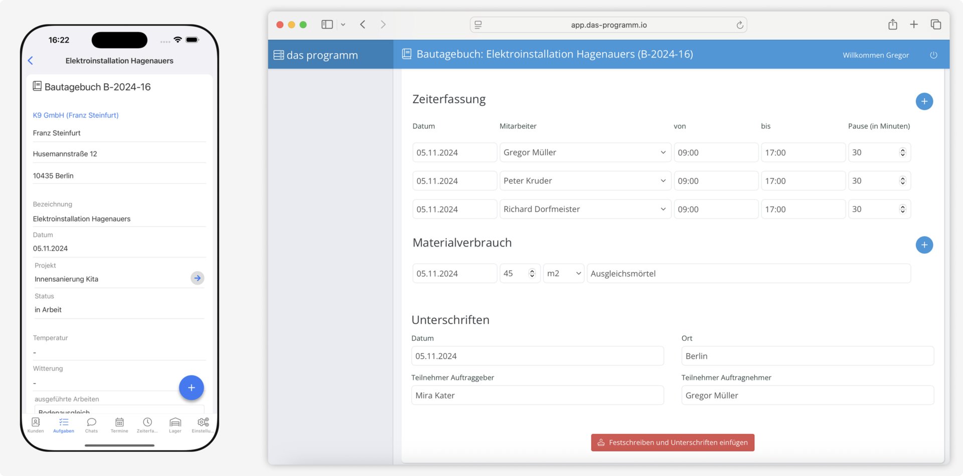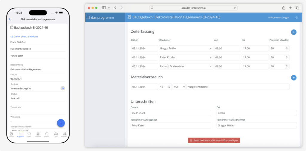 Ja. Das Programm eignet sich besonders für Bauunternehmen: Aufträge, Bautagebuch, Material und Nachweise sind an einem Ort gebündelt. So behältst du auch bei großen Projekten den Überblick.