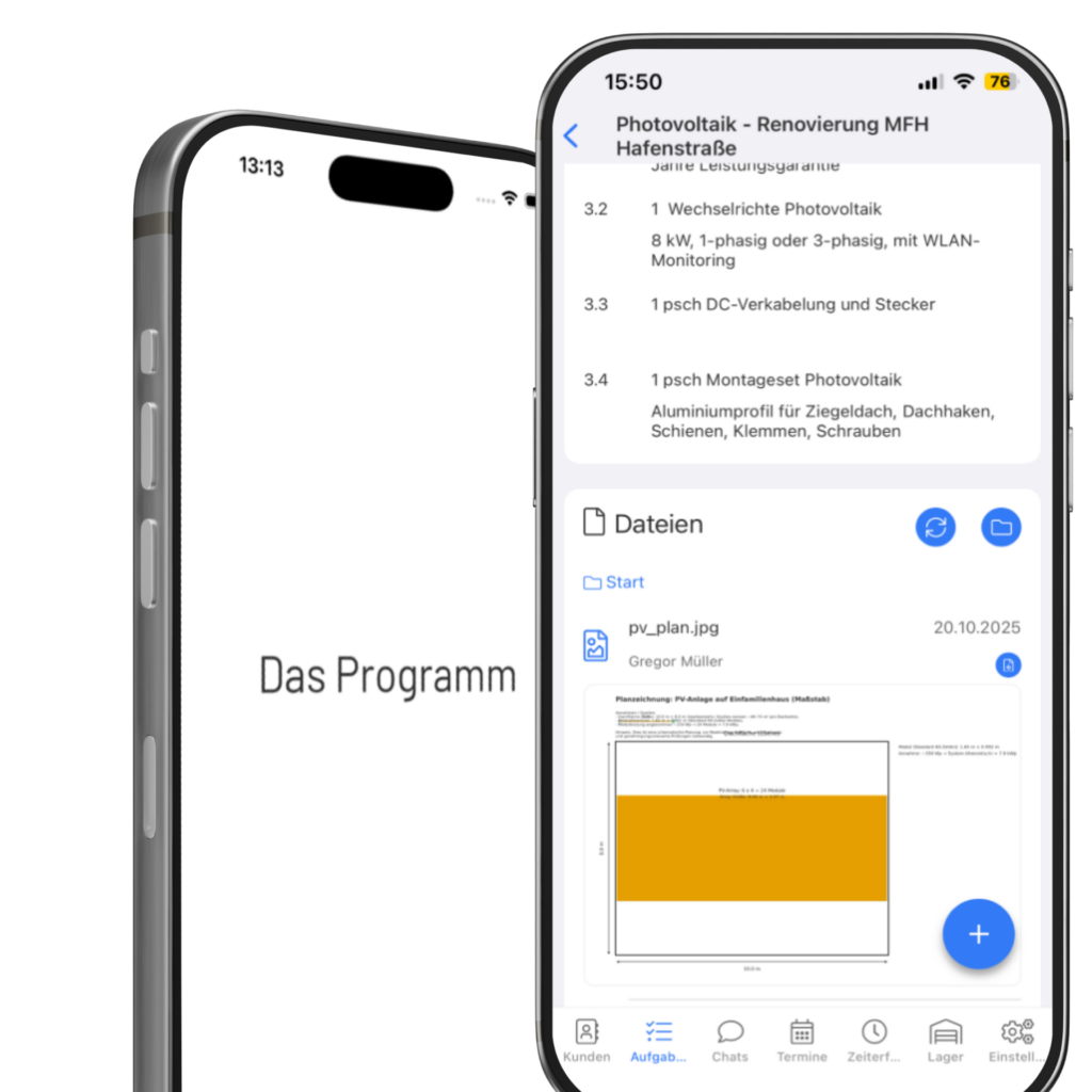 Ja. Mit der Energieberater App von unserem Programm hast du alles griffbereit – von Messwerten und Fotos bis zu Kundenunterschriften und Nachweisprotokoll. Die App funktioniert auf Android und iOS, speichert alle Daten automatisch in der Cloud und synchronisiert sie mit dem Büro. So bist du immer auf dem neuesten Stand – ob beim Kunden, im Büro oder unterwegs.