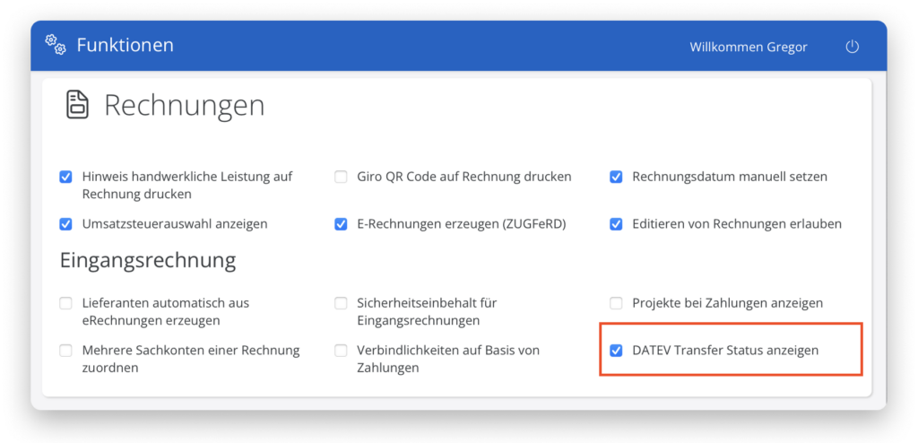 Einstellungen → Funktionen → Rechnungen → DATEV Transfer Status anzeigen