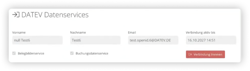 Stimme der Verarbeitung zu. Du wirst darauffolgend zum Programm zurückgeleitet. Ist die Verbindung erfolgreich hergestellt, siehst du nun anstelle der “Mit DATEV verbinden” Schaltfläche eine “Verbinung trennen” Schaltfläche. Außerdem erhältst du Informationen dazu, bsi wann die Verbinudung gültig ist und welche Services aktiviert sind.