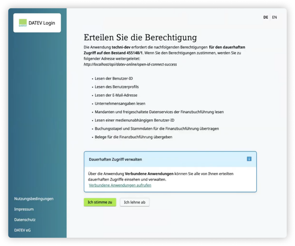 Mit einem Klick auf die “Mit DATEV verbinden” Schaltfläche, wirst du zu DATEV Unternehmen Online (DUO) weitergeleitet. Die Konfiguration geht von hier aus weiter: