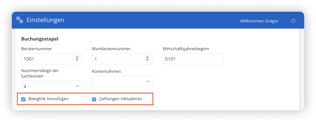Die fünf Felder (Beraternummer, Mandantenummer, Wirtschaftsjahrbeginn, Nummernlänge der Sachkonten, Kontenrahmen) werden durch die erfolgreiche Verbindung mit DATEV vorausgefüllt und sind in Folge ausgegraut. Du kannst keine Änderungen daran vornehmen.
