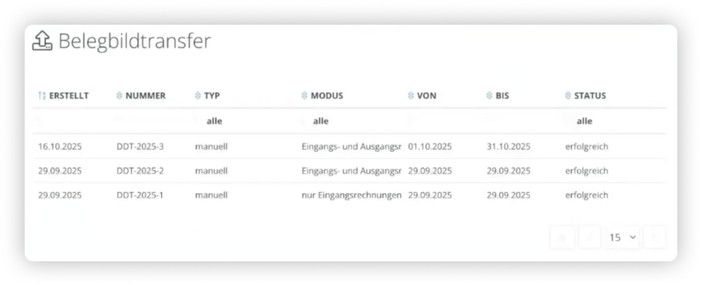 Du überträgst beim Belegbilderservice ausschließlich die PDFs deiner Ein- und Ausgangsrechnungen. Um Buchungen zu übertragen, nutze den Buchungsstapel Transfer.