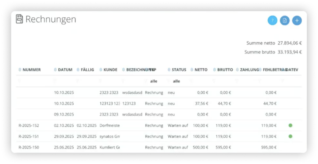 Zuletzt ist auch in deiner Rechnungsübersicht verzeichnet, ob eine Rechnung an DATEV übertragen wurde. Rechnungen, die übertragen wurden, sind in der Rechnungsübersicht mit einem grünen Punkt markiert.