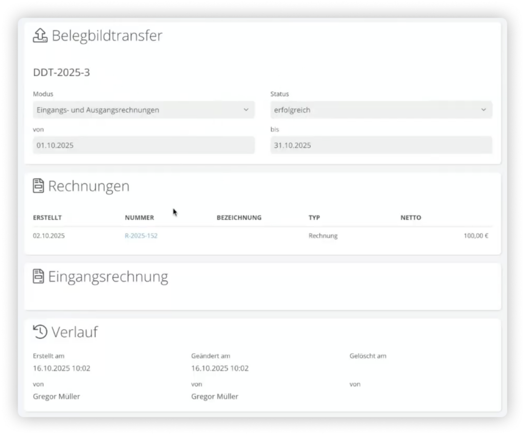 Das Programm überträgt jede Nacht deine neuen Ein- und Ausgangsrechnungen an das DATEV Rechenzentrum. Über das Logbuch hast du volle Einsicht in jeden Transfer.