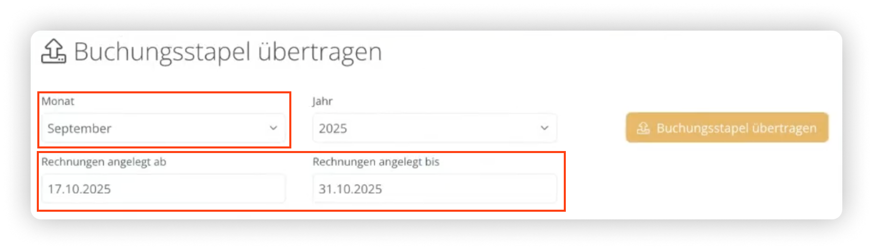 Um den Buchungsstapel Transfer durchzuführen, klicke links im Hauptmenü auf “Buchhaltung”. Wähle den gleichen Zeitraum aus, wie bei deiner Prüfung und klicke auf “Buchungsstapel übertragen” um die Übertragung durchzuführen.