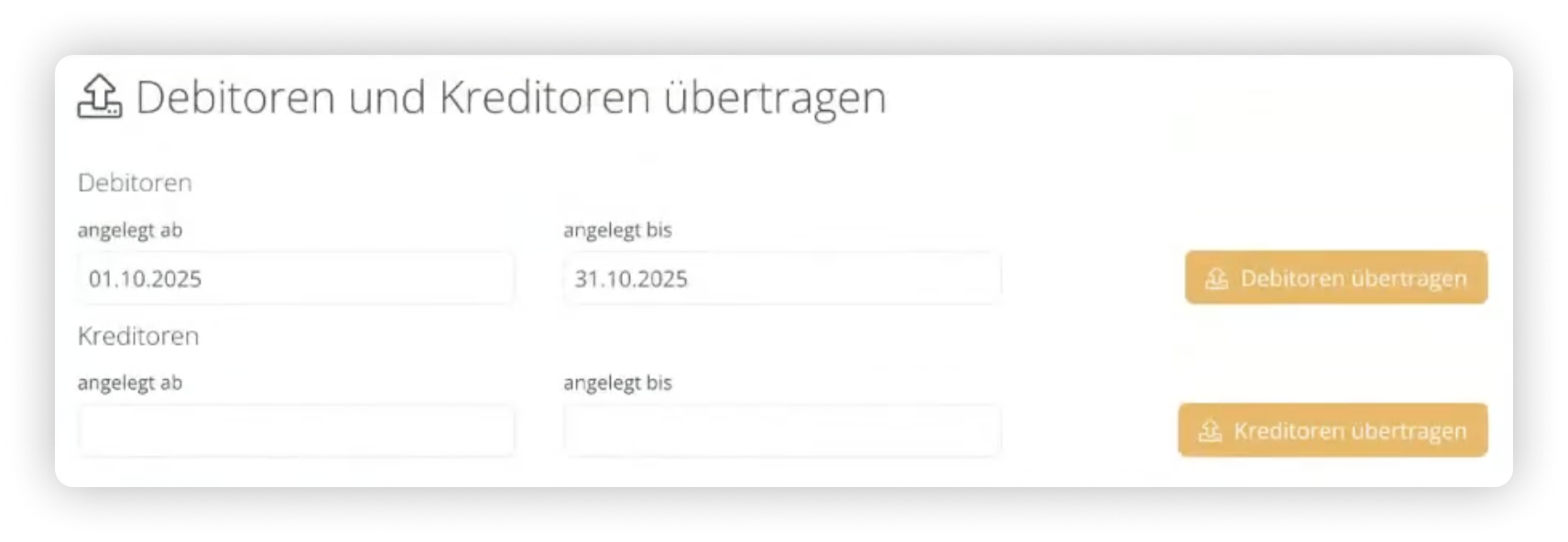 Wähle links im Hauptmenü “Buchhaltung”. Unter “Debitoren und Kreditoren übertragen” findest du Eingabefenster, mit denen du jeweils den Zeitraum auswählst, aus dem du neue Debitoren und Kreditoren an DATEV übertragen möchtest. Mit einem Klick auf die orangene Schaltfläche löst du den jeweiligen Export aus.